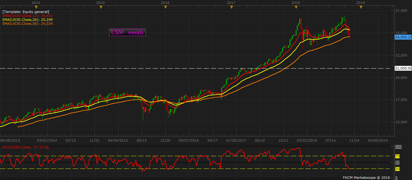 U.S. Industrial benchmark index, Dow Jones Industrial Average (DJIA) has come under fire after reaching an all-time high around 27000 area (US30) in early October. Since then, it has come under intense selling pressure.