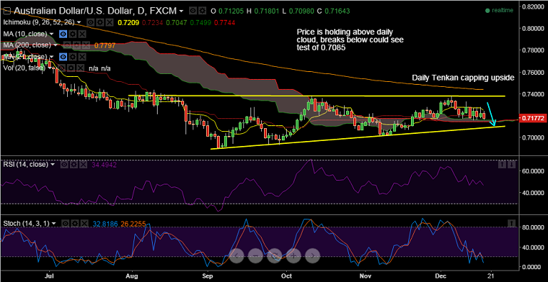 - Upside in the pair is capped by Daily Tenkan at 0.7250, Aussie slips below 0.72 handle, was down at 0.7179, selling looks incomplete - fresh intraday lows made.