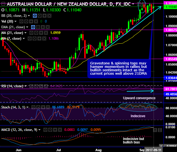 Thereby, the momentum in these rallies seem to have been hampered momentarily as these bearish pattern candles indicate weakness at stiff resistance levels of 1.1139 but bullish sentiments still remain intact as the current prices well above 21DMA.