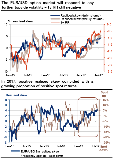 As we have emphasized, the ECB still has to clarify how the QE process will reverse. The 2015-17 EURUSD range corresponded to its asset purchase period, and, more globally, the negative skew period (since 2009) corresponded to global central banks’ accommodation. As the market is still awaiting the next steps from the ECB and Fed, the full positive impact on the EURUSD skew is probably yet to be seen.