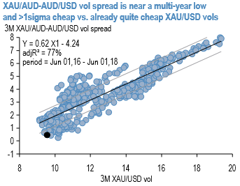 At multi-year lows, an artifact of uber-depressed Gold vols, the XAUAUD - AUDUSD vol spread can be considered to be an RV-friendly expression of outright XAUUSD vol (refer 1st chart), which by all accounts is quite cheap in its own right.