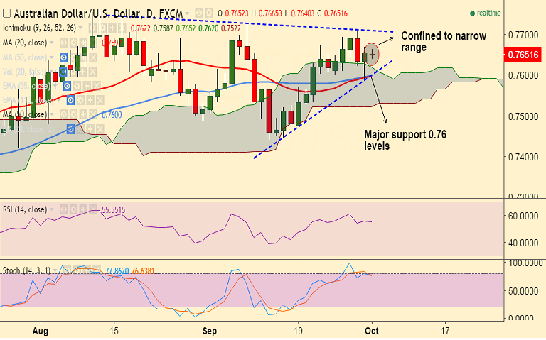 - Major support levels - 0.7620 (cloud top), 0.76 (20 & 50 DMA and trendline), 0.7589 (Sept 30 low)
