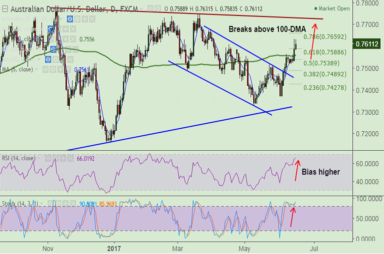 - The pair has shown decisive break above major resistance at 0.7555 (100-DMA) raising scope for test of trendline resistance at 0.7730.
