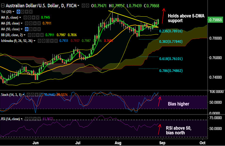 Resistance levels - 0.7962 (Aug 17 high), 0.7968 (weekly 200-SMA), 0.80, 0.8042 (Aug 1 high)