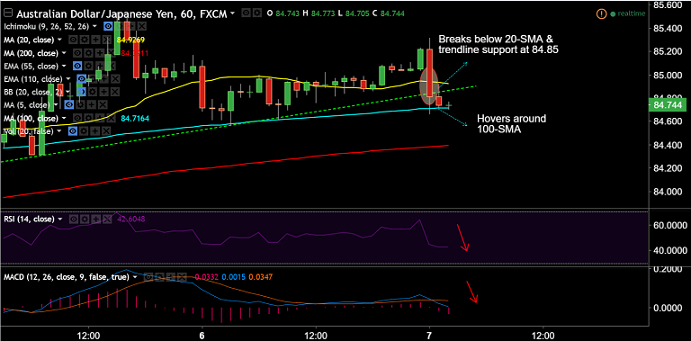 - Support levels - 84.80 (5-DMA), 84.71 (1H 100-SMA), 84.05 (38.2% Fib of 102.84 to 72.43 fall)
