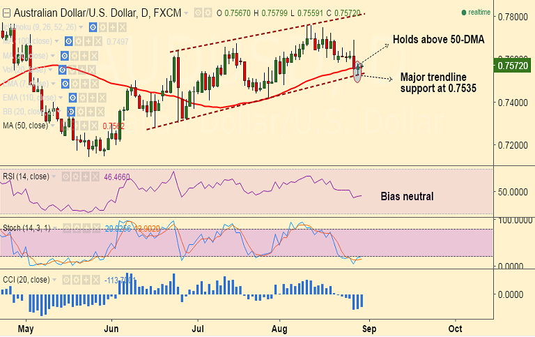 - The pair finds major support by channel base at 0.7535, break below will see drag upto 100-DMA at 0.75.