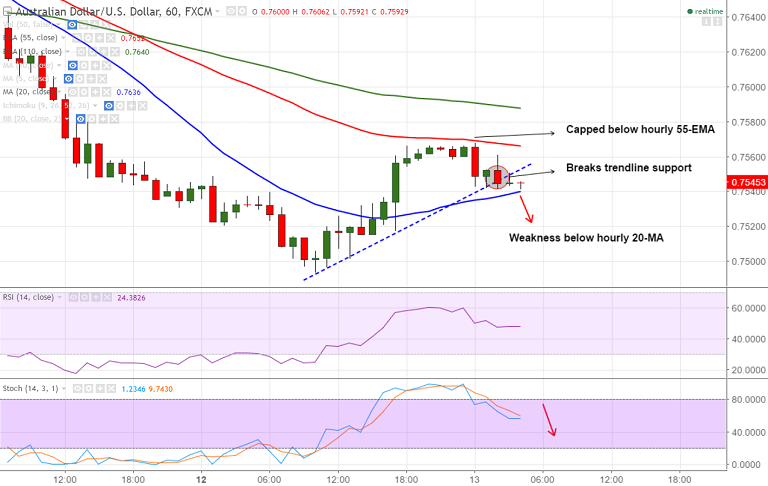 - AUD/USD recovery stalls shy of hourly 55-EMA (0.7569), the pair has slipped lower to currently trade at 0.7541.