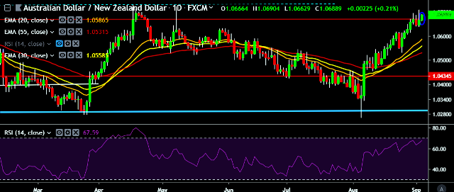 - AUD/NZD is currently trading around 1.0689 marks.