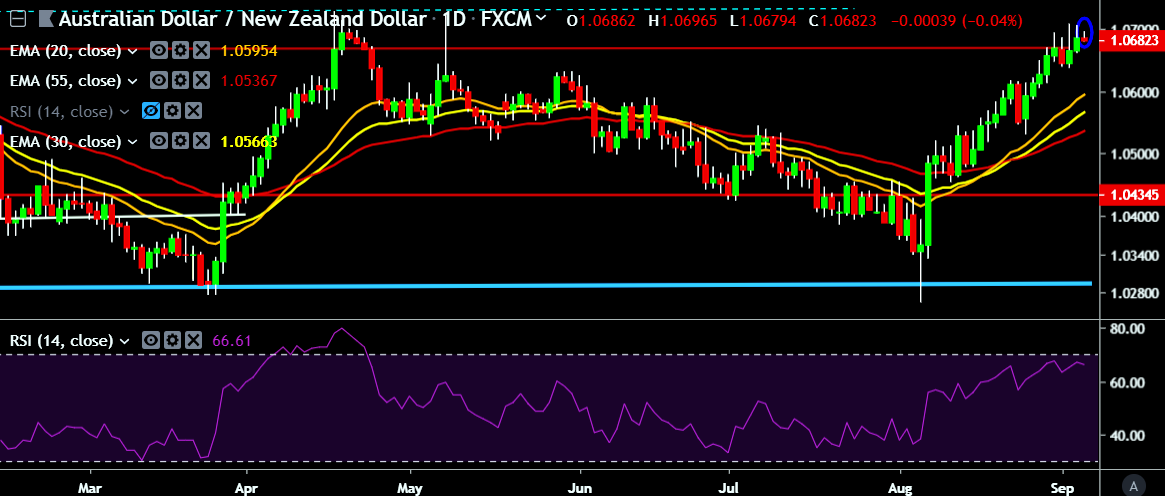 - AUD/NZD is currently trading around 1.0685 marks.