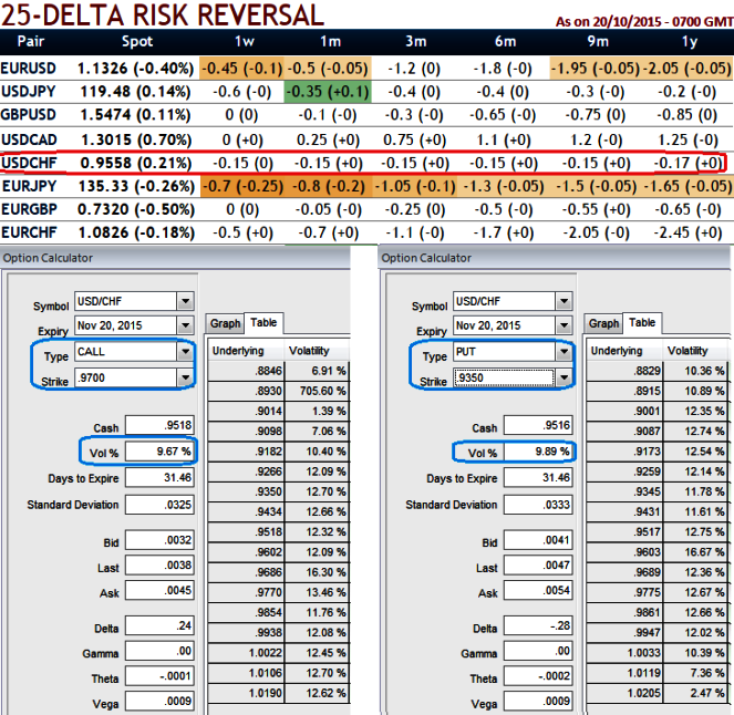 2% OTM call (strike at 0.9700) = 9.67%, thus, the risk reversals of ATM contracts of 1 month maturities have no significant disparities between at the money and out of the money instruments.