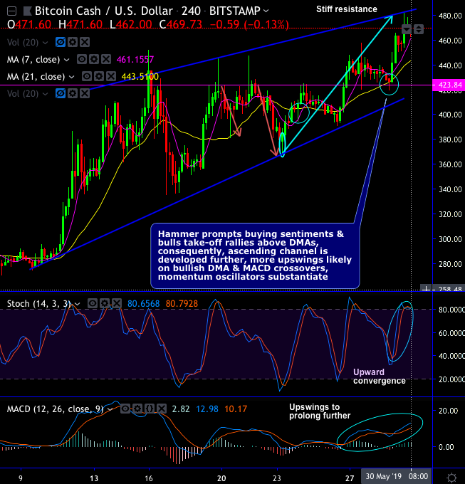 Bitcoin cash (BCHUSD) has formed hammer pattern at $426.63 levels that prompt buying sentiments, consequently, bulls take-off rallies above DMAs, and ascending channel has been formed in the minor trend.
