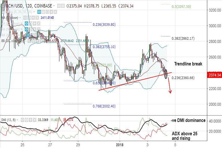 BCH/USD has broken strong support at 2385 on 2H charts, bias bearish.