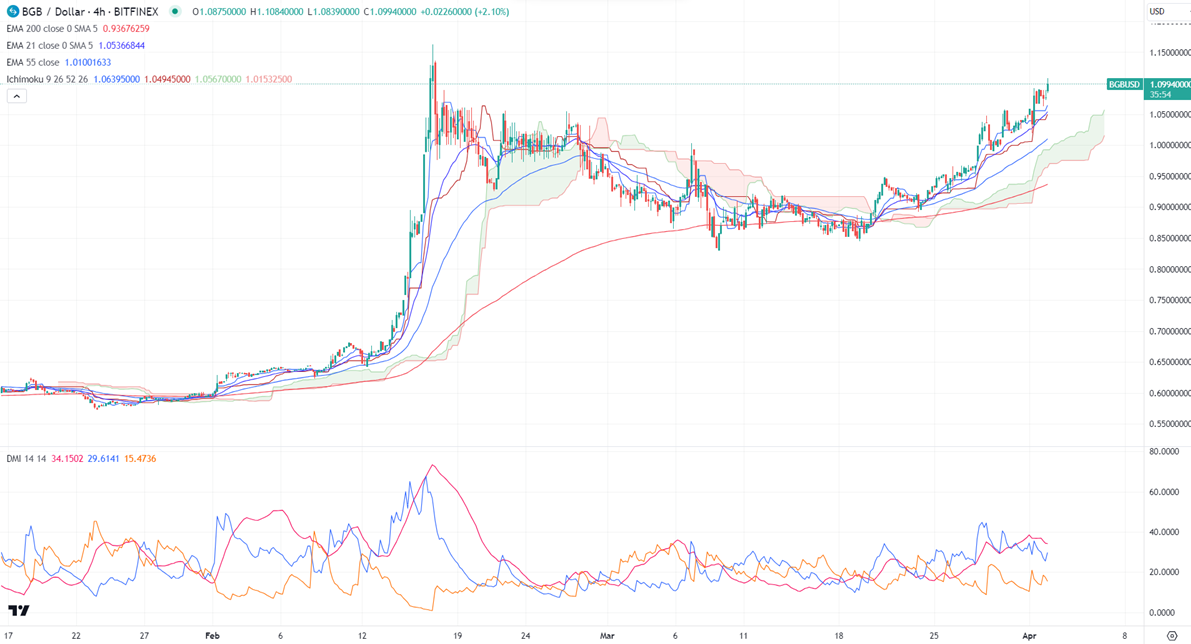 JUPUSD prices have surged more than 30% in the past two weeks. It hit a high of $1.10 and is currently trading around $1.0990. The pair is holding above the short-term (21 and 55-day EMA) and above the long-term moving average (200-day EMA).