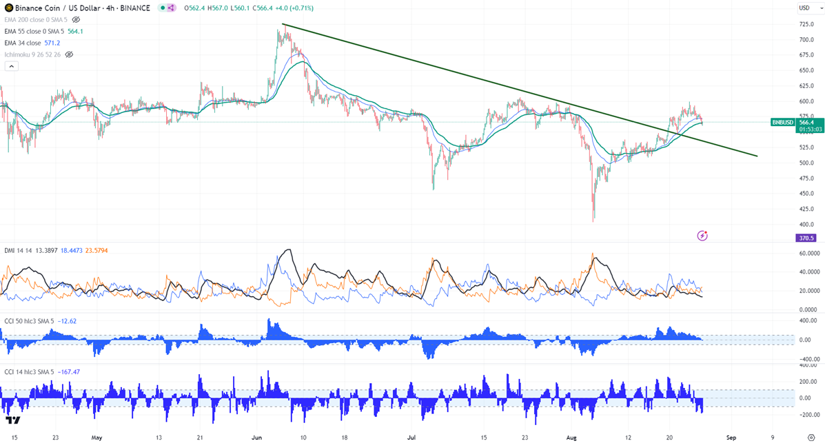 BNBUSD showed a nice recovery of nearly $200 from this month's low of $403.40.The pair holds well above the short-term (21 and 55 EMA) and long-term moving average. It hit a high of $598.8 and is currently trading around $566.10.