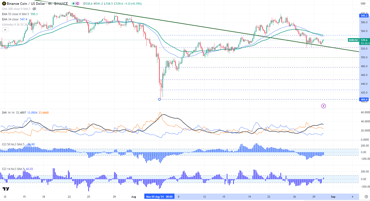 BNBUSD has taken support near the 200-day EMA and showed a minor pullback. The pair holds below the short-term (34 and 55 EMA) and long-term moving average in the 4-hour. It hit a high of $575 this week and is currently trading around $540.70.