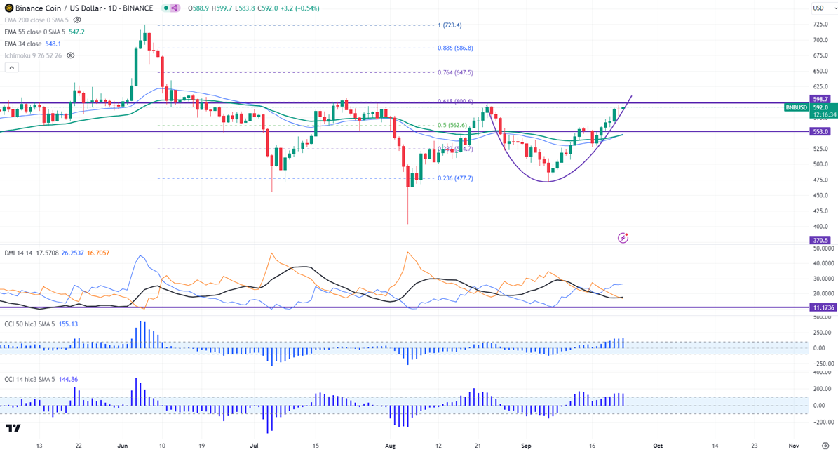 BNBUSD trades higher for the third consecutive week. It hit a high of $599 and is currently trading around $590.90.