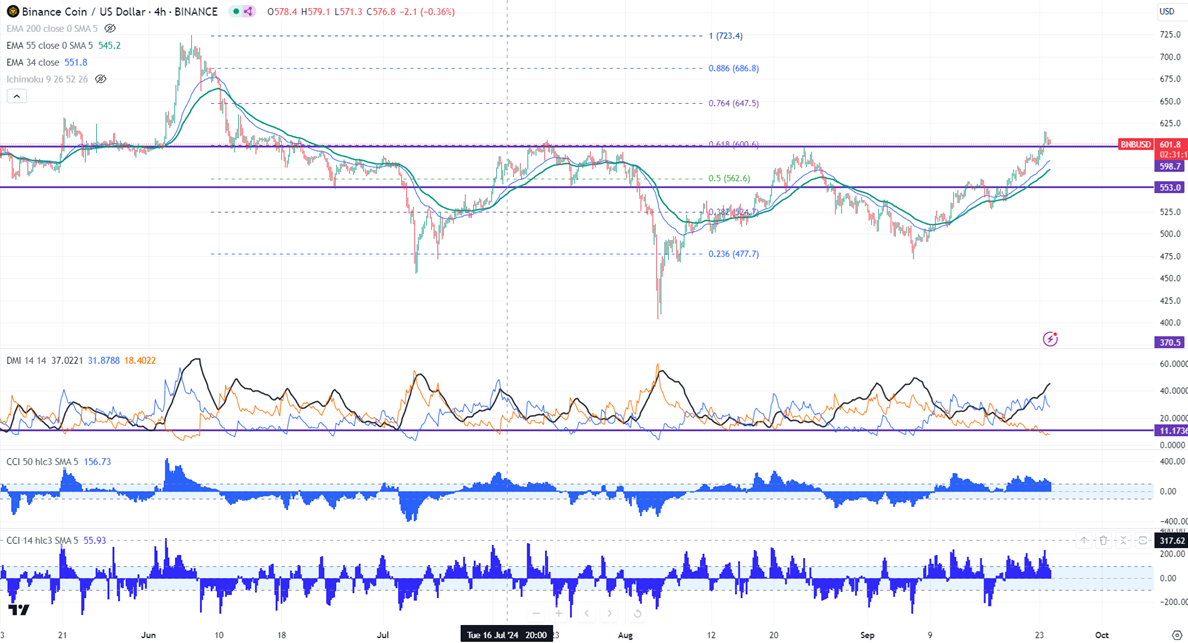 BNBUSD breaks psychological resistance $600 after a long consolidation. It hits a high of $614.80 and is currently trading around $600.50.