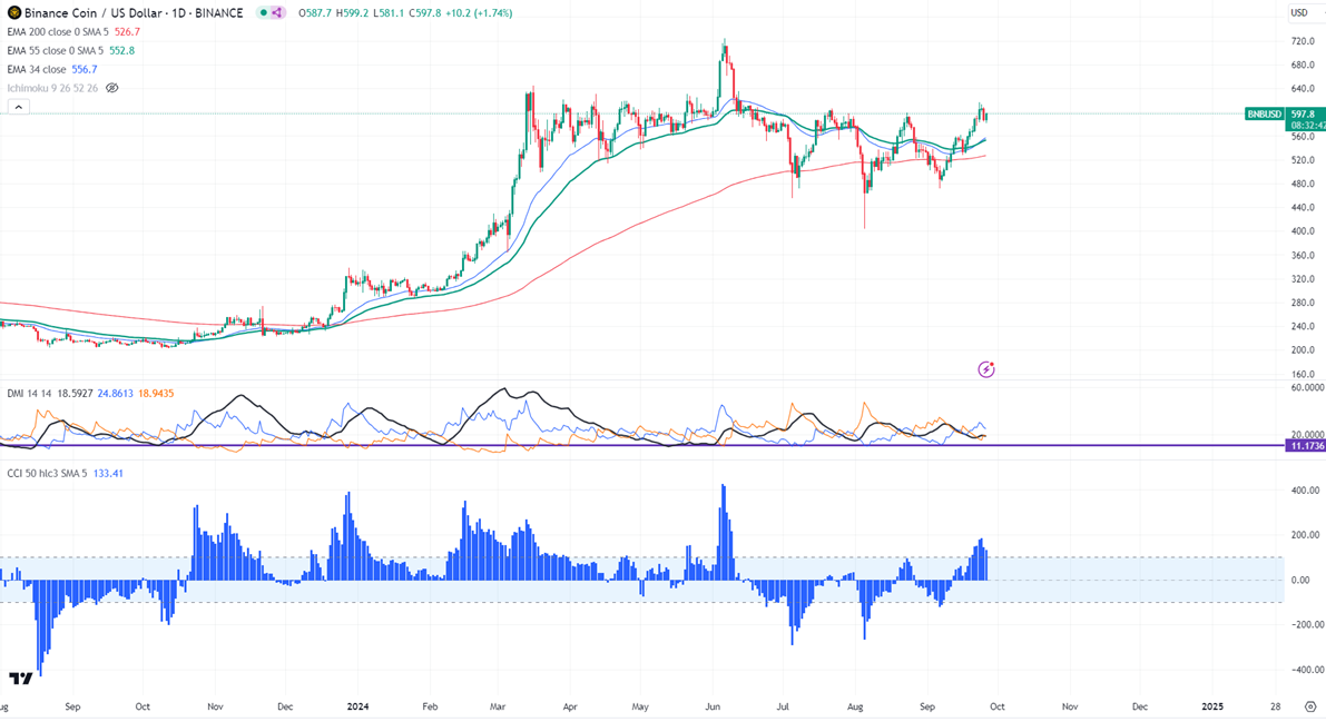 The pair holds above 34 and 55 EMA in the 4-hour chart. The bullish trend continuation can happen if the pair closes above $600 in the weekly chart. On the lower side, the near-term support is $580. Any break below targets $562/$554/$540 is possible.