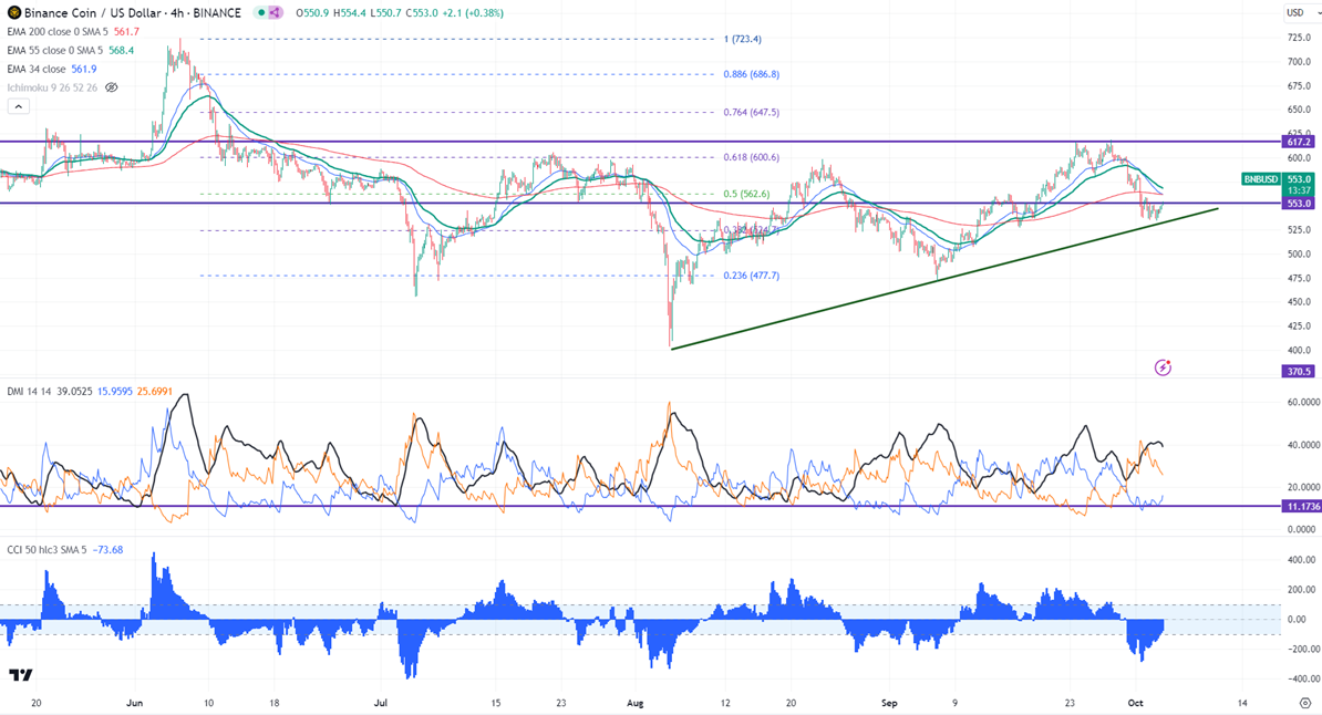 BNBUSD took support near the trend line and showed a minor pullback. It hits a low of $534.70 and is currently trading around $553.