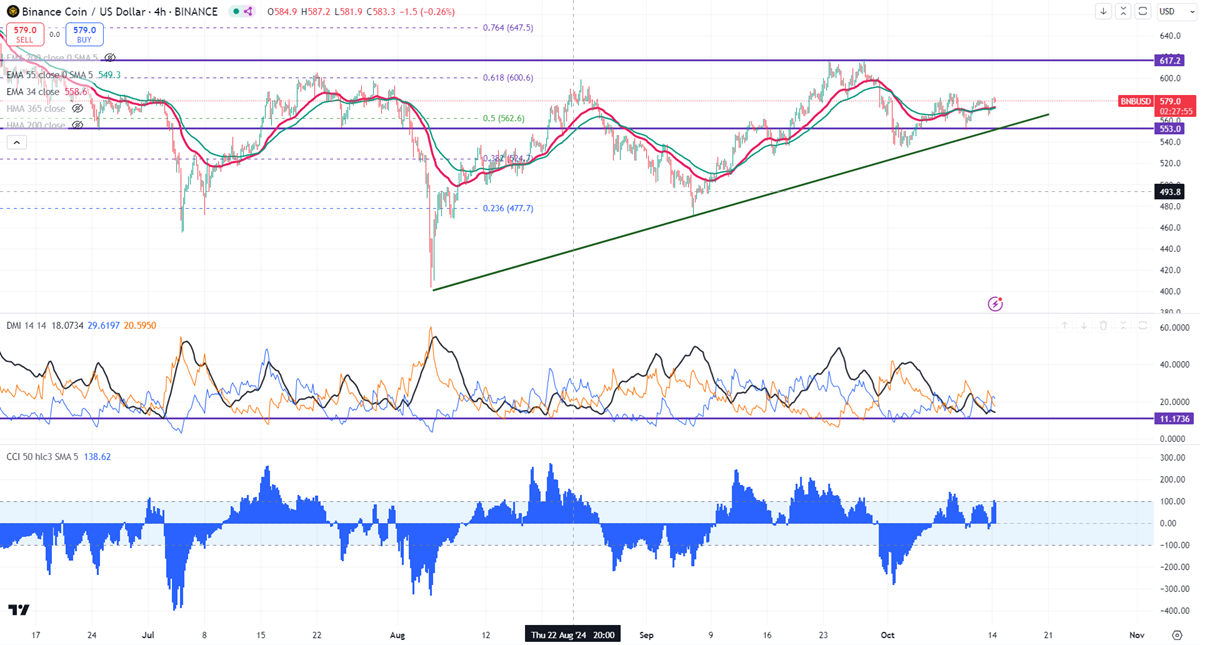 BNBUSD trades in a narrow range between $586 and $pared some of its gains after forming a minor top around $586.30. It hit a high of $582.80 at the time of writing and is currently trading around $579.