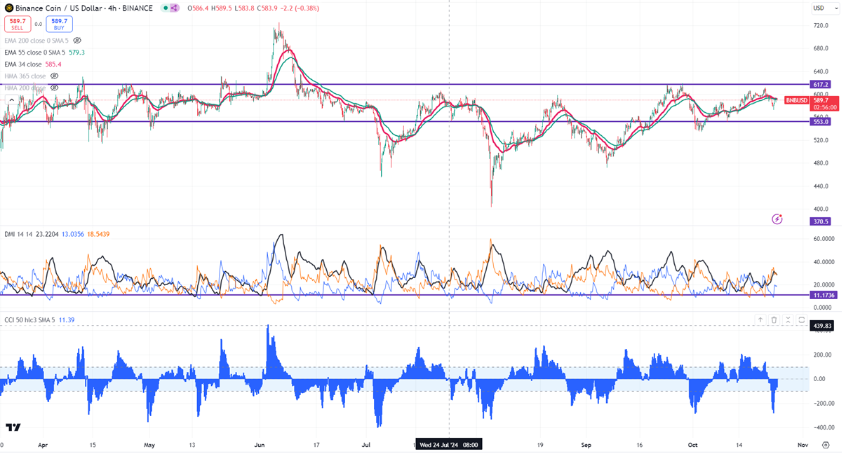 The BNB/USD pair took support near 55- day EMA and showed a minor pullback. Current momentum is neutral, with prices remaining above both the 34 and 55 EMA on the 4-hour chart. The pair should close above 620 for further bullishness. Conversely, a drop below $570 could indicate a bearish trend for the day. A breach of this level might lead to further declines toward $560, $550, $540, $528, $500, and potentially $470.