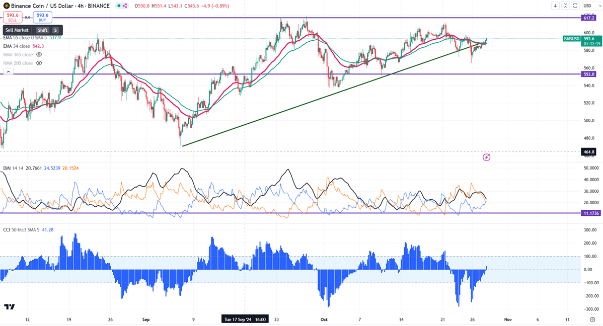 The BNB/USD pair showed a minor pullback after hitting a low of $565. Current momentum is neutral, with prices remaining above both the 34 and 55 EMA on the 4-hour chart. The pair should close above 615 for further bullishness. Conversely, a drop below $565 could indicate a bearish trend for the day. A breach of this level might lead to further declines toward $550, $540, $528, $500, and potentially $470.