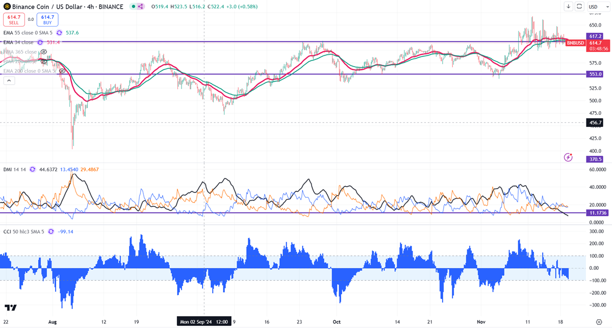 Intraday bias remains bullish as long as support $585 holds. It trades below the 34 and 55 EMA on the 4-hour chart. If the pair closes below $600, potentially leading to further declines towards $585/ $559,$545, $528, $500, and possibly down to $470.