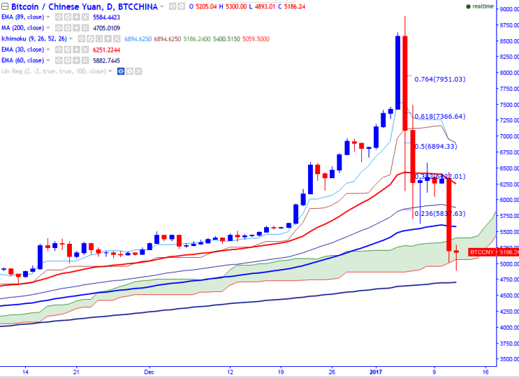 BTC/CNY is seen trading below in red on Thursday. The pair has broken major support at 5600 and declined sharply till 4893 at the time of writing. It is currently trading around 5190 at the time of writing.