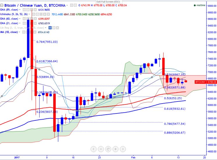 BTC/CNY pair has shown a mild recovery till 6799 after declining till 6597. BTCC/CNY faces minor resistance at 6800 (daily Tenken-sen) and any minor bullishness can be seen only above that level (BTCCHINA). It is currently trading around 6732 at the time of writing.