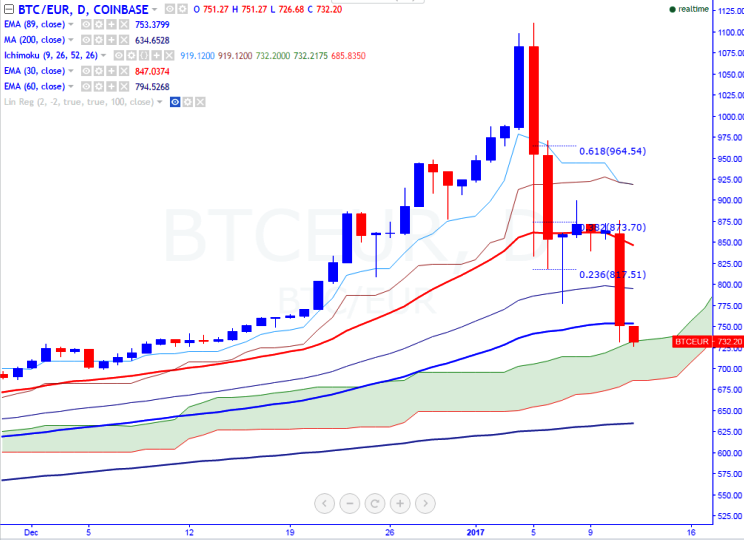 BTC/EUR trades below on Thursday and has broken major support at 752 and declined till 726.It is currently trading around 735.49 at the time of writing.