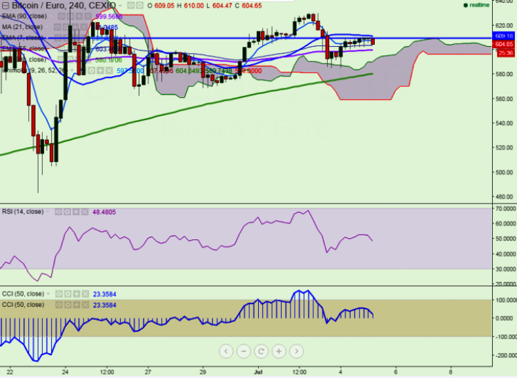 BTC/EUR is seen trading in red on Tuesday. The pair is consolidating in narrow range of 609 and 585 levels (CEXIO) for past two trading session. It is currently trading at 608.18 at the time of writing.