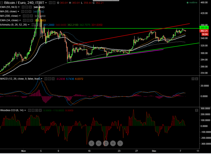 BTC/EUR has made a high of 369.80 yesterday and started to slightly decline from that level. It is currently trading around 362. Intraday trend is bullish as long as support 340 holds.