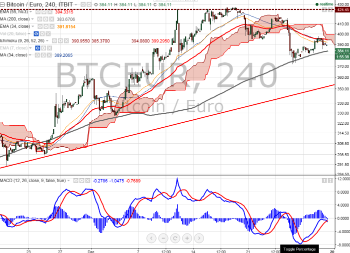 - BTC/EUR has declined till 385 after making a high of 397.80. It is currently trading around 389.49.