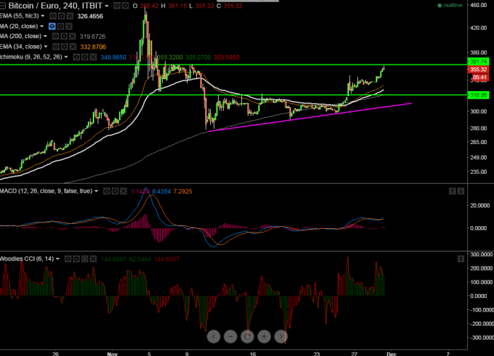 - BTC/EUR has broken major resistance 348 and jumped till 361 level. It is currently trading around 358 level.