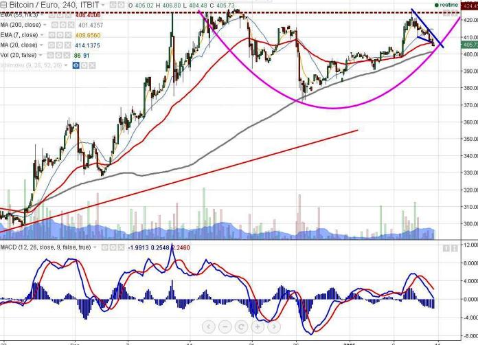 - BTC/EUR has made a high of 426 and declined from that level. It is currently trading around 405.