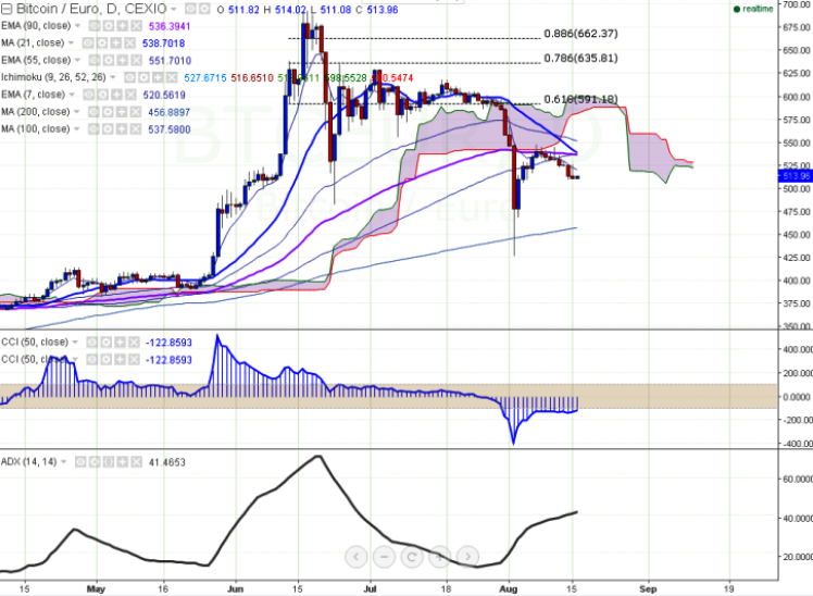 BTC/EUR is seen trading in slightly above on Tuesday after the plunge. The pair has made a temporary top at 547 (Aug 7th high) and declined from that level (CEXIO). It is currently trading around 513.97 at the time of writing.