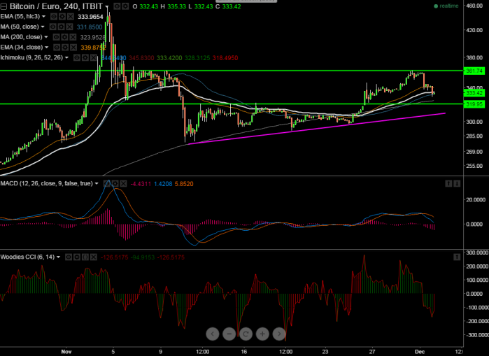 - BTC/EUR has made a high of 363 and declined till 328 from that level. Intraday trend is still bullish as long as support 325 holds.