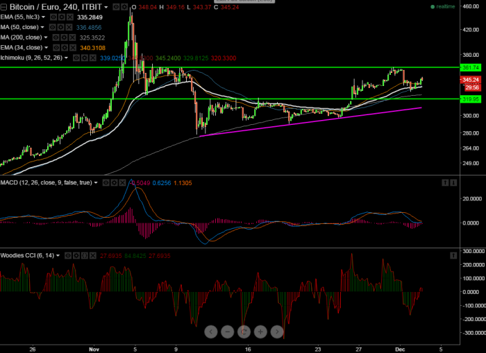 - BTC/EUR has recovered after making a low of 328. Intraday trend is still bullish as long as support 325 holds.