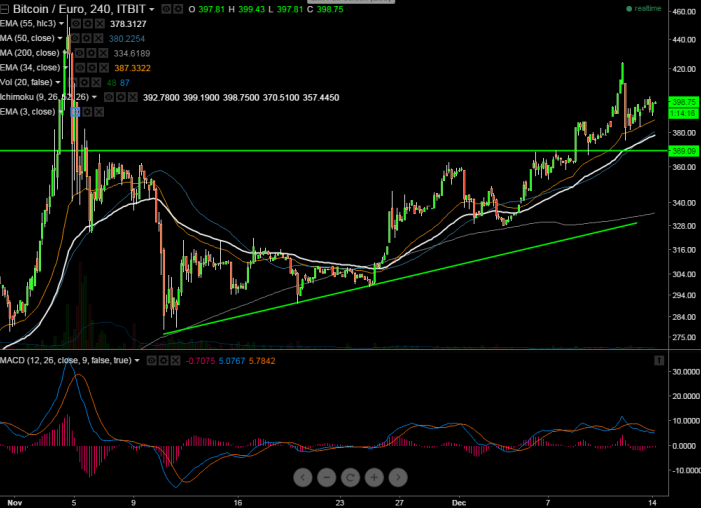 - BTC/EUR has broken trend line resistance 390 and jumped till 424.96 . It is currently trading around 398.75. Short term trend is still bullish as long as support 375 holds.