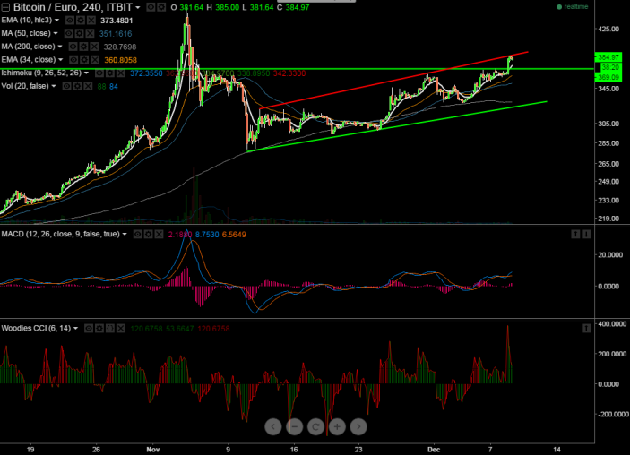 - BTC/EUR has broken resistance 370 and jumped till 386and it is currently trading around 384.