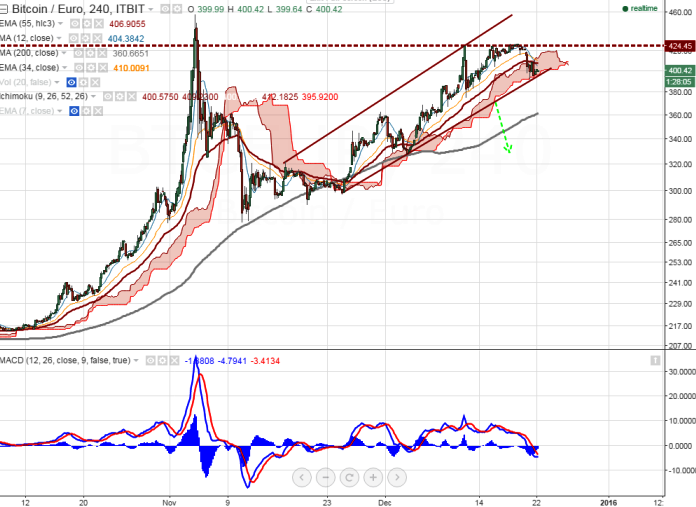 - BTC/EUR has declined till 390 after making a high of 426.84 on Friday. It is currently trading around 400.
