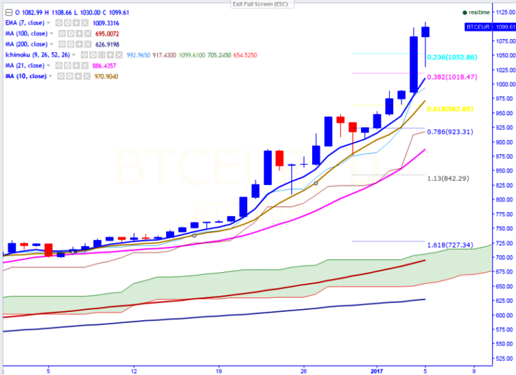 BTC/EUR has jumped well above 1000 yesterday and hits a fresh life-time high (COINBASE). The pair has close well above psychological level 1000 and is expected to go further in the coming days. It is currently trading around 1100.20 at the time of writing.