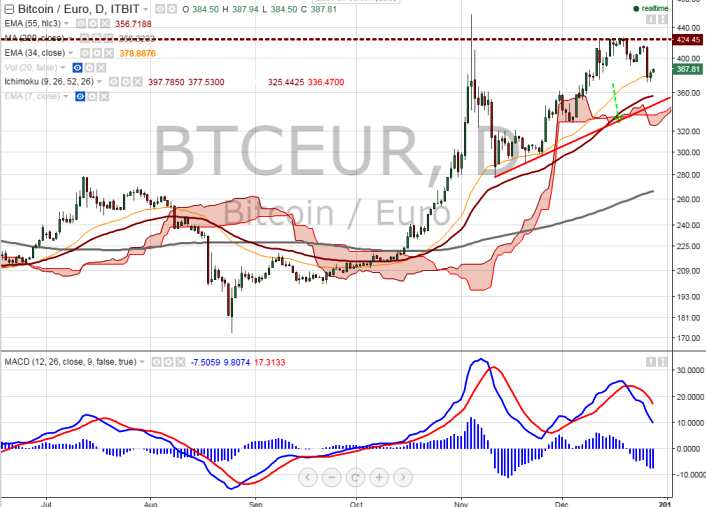 - BTC/EUR has declined till 371 and slightly recovered from that level. It is currently trading around 387.80.