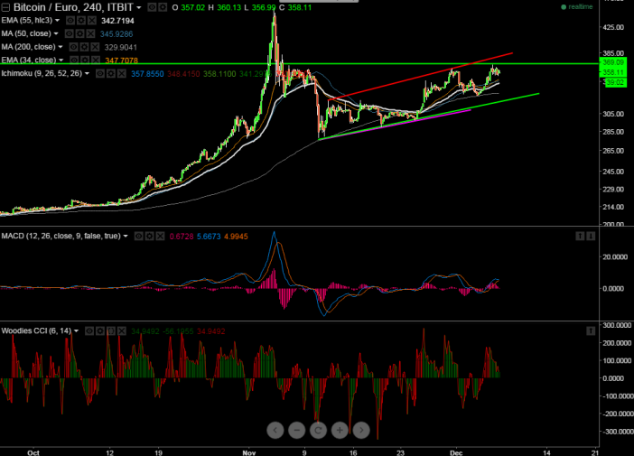 - BTC/EUR has recovered till 368.64 yesterday and started to slightly decline from that level. It is currently trading around 358.11. Intraday trend is bullish as long as support 340 holds.