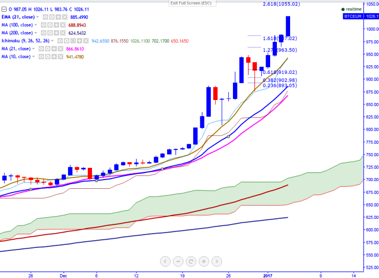 BTC/EUR has broken major resistance at 1000 and jumped sharply till 1025 (COINBASE). The pair has made fresh life-time high and is expected to go further in the coming days. It is currently trading around 1026.21 at the time of writing.