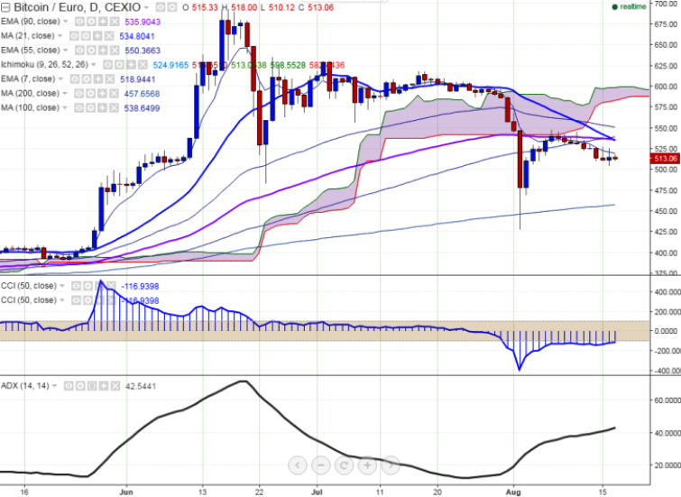 BTC/EUR is seen trading well below on Wednesday. The pair has slightly jumped till 527 on Aug 15th after making a low of 511 levels (CEXIO). It is currently trading around 514 at the time of writing.