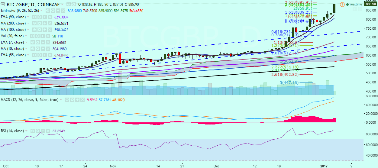 BTC/GBP continued its uptrend on Wednesday and is currently trading at 885 levels at the time of writing (Coinbase).