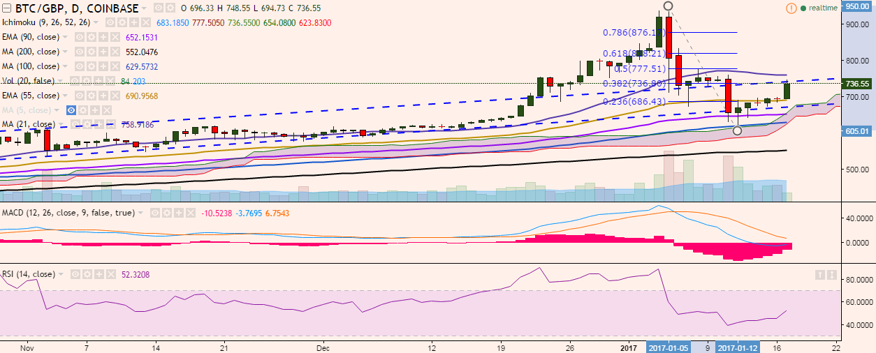 BTC/GBP continued its uptrend on Tuesday and hit a high of 748 levels so far in the day. It is currently trading at 735 levels at press time (Coinbase).
