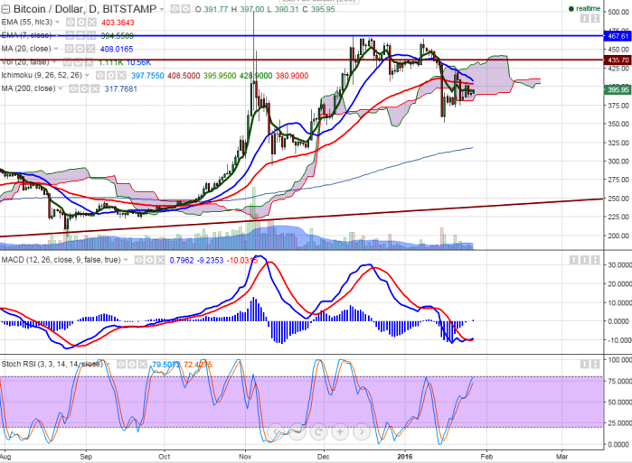 - BTC/USD is consolidating in narrow range between $350- $425. It is currently trading around $396.