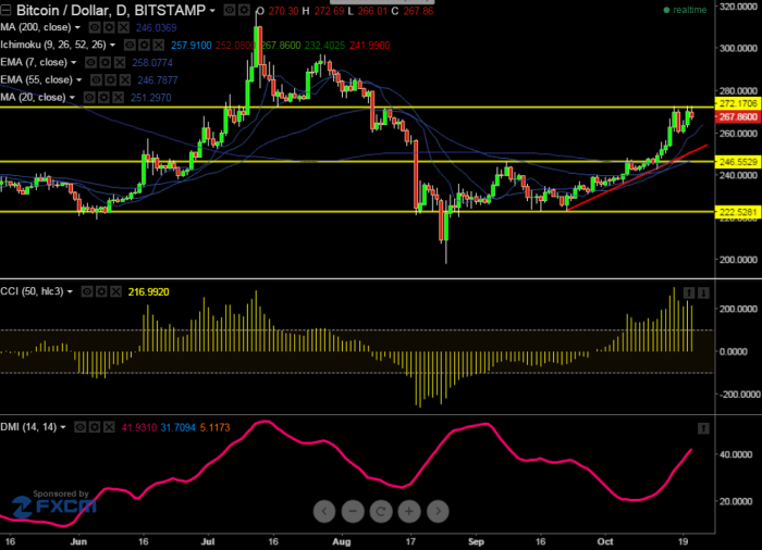 BTC/USD has made a high of $272.95 and started retreats from that level. It is currently trading at $ pair has almost formed a double top around $273 and any further movement can be seen only above that level.